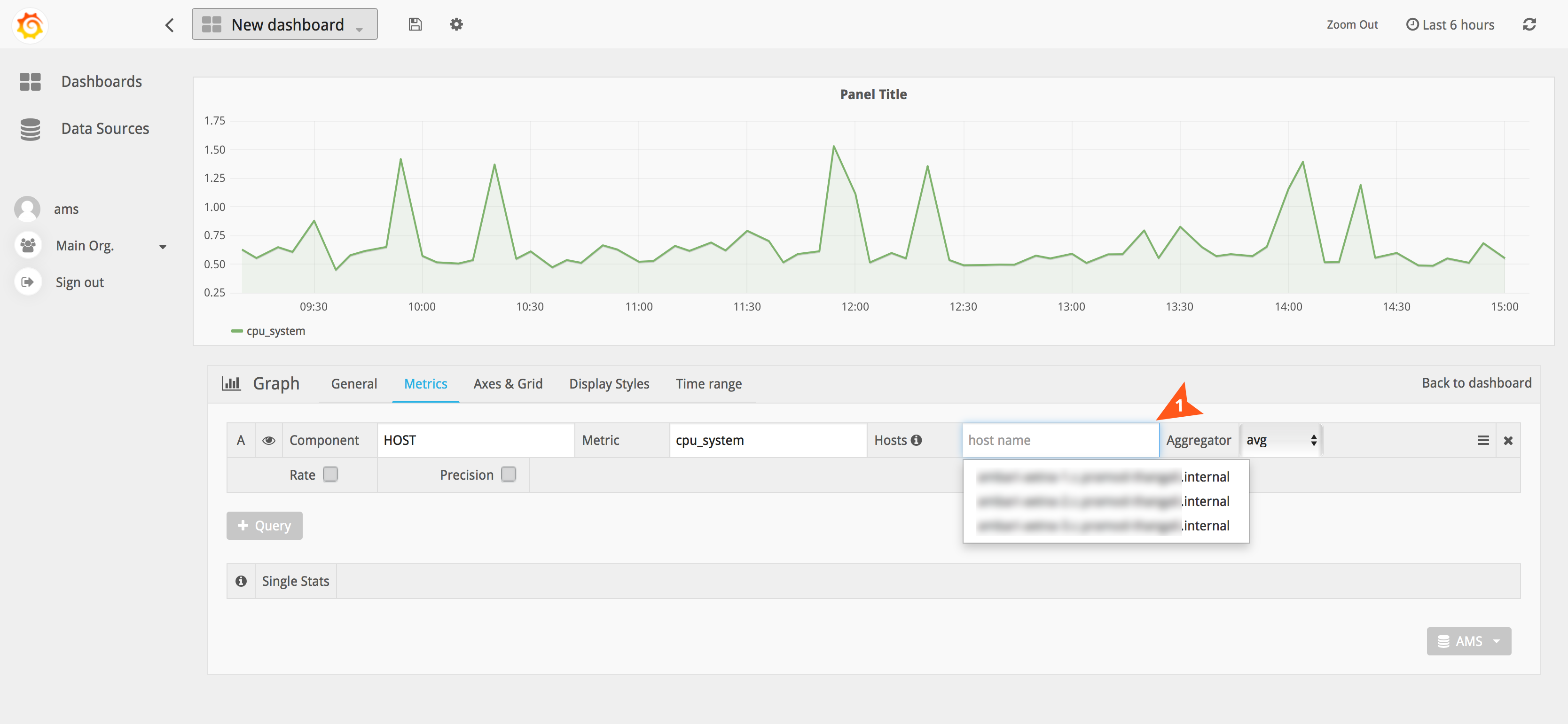 10. When you now add a graph, and select your component and metric, the plotted graph will show you metrics for the selected hostname from the dropdown.