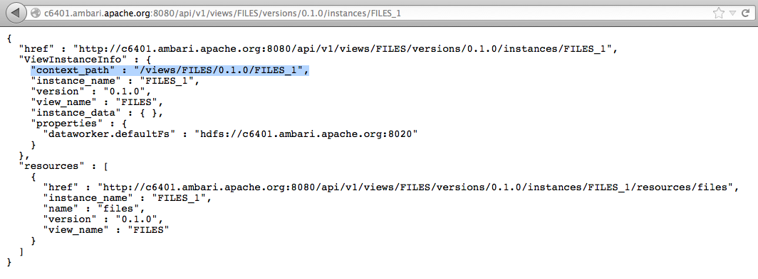 "href" : "http://<server>:8080/api/v1/views/FILES/versions/0.1.0/instances/FILES_1",